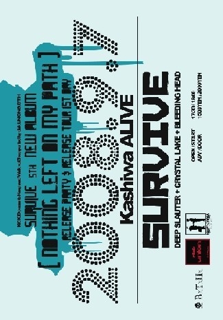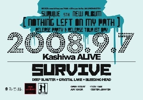 告知失礼致します! KC KID presents Keep and Walk vol.3 SURVIVE 5th NEW ALBUM 「NOTHING LEFT ON MY PATH」RELEASE PARTY & RELEASE TOUR FIRST DAY date 2008年9月7日(日曜日) place 柏ALIVE act SURVIVE DEEPSLAUTER CRYSTAL LAKE BLEEDING HEAD 料金(別途ドリンク代) 前売り:1500円 当日:2000円 OPEN/START 17:30/18:00 (問・予約)keep_and_walk@yahoo.co.jp または各バンドさんまでお願い致します。 8/22に待望の5thアルバムをリリースするSURVIVEのリリースパー