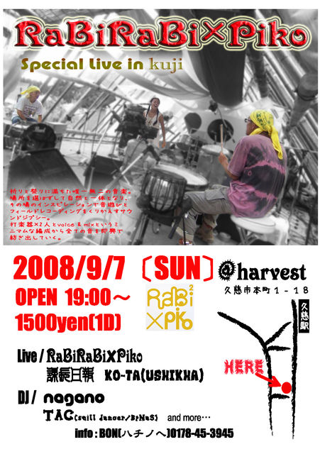 RaBiRaBi×PIKO 9/7(SUN) @HARVEST 1500yen(1drink) GUESTLIVE RaBiRaBi×PIKO http://www.rabirabi.com/ Live KO−TA(USHIKHA) katyounippou まったり〜ず DJ NAGANO TAC(still dancer/BpNaS) VJ/NOB!TA(DAT・DISCOVERY) 出店 UPOPO 苫屋 問合せ: BON(八戸) 0178-45-3945