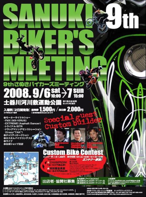 9月6,7日、香川県仲多度郡まんのう町造田 土器川河川敷運動公園にて 「2008 9thさぬきBIKER’S MEETING」が開催されます。 モーターサイクルショー トライアル・BTR EXTREME ドラッグマシーンデモンストレーション FMX などがあり楽しめるイベントだと思います。 昨年のFMXの様子はボクの動画にてUPしています。 前売り券1,500円 当日券2,000円 当日券より前売り券が500円安いので来るのが決まっていればボクの方で段取りします。 (天気の都合によりモーターサイクルショー有無があるか
