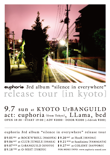 告知失礼いたします。 bed出演のイベントになります! 東京のeuphoriaの3rdアルバムレコ発ツアー京都編で、スリーマンです! euphoria 3rd album "silence in everywhere" release tour 9/7(日) at 京都UrBANGUILD OPEN 18:30・START 19:00 前売 ¥2000・当日 ¥2300 act: bed, euphoria (from Tokyo), LLama お問い合わせ: UrBANGUILD 075-212-1125 euphoria 公式サイト http://www.euphoria-sound.com/ euphoria Myspace http://www.myspace.com/euphoriamyspace どうもありがと