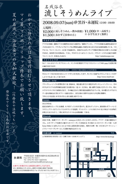 風情あるお寺のお庭にてゆるりしませんか? そうめん流しつつ、音に身を委ねつつ、去り行く夏を送る会。 そして、浴衣を着納めませんか?浴衣歓迎! 民族楽器+デジタル+α…といった感じのライブ、good vibesなDJs。 老若男女問わず楽します。 昼寝もできます。 9/7(日) 黒谷 永運院@京都 「名残浴衣&流しそうめんライブパーティー」 12:00-18:00 2000円飲み放題+流しそうめん 中高生1000円。子供は無料。 ※おかず持参の方は1500円にdiscount! ※マイ箸・マイ皿・マイコップ持参でお願いします。
