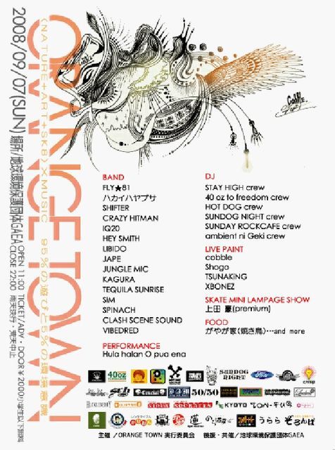 告知失礼致します。 いよいよ1ヶ月をきりました。京都、屋外型複合フェスORANGE TOWNです。 ☆ORANGE TOWN☆ (Nature+Art+SK8)×Music 95%の遊びと5%の環境意識 9月7日(日) @地球環境保護団体GAEA OPEN11:00/CLOSE22:00 TICKET¥2000 ※小学生以下無料 雨天決行・荒天中止 自然の中で音、様々なカルチャーと触れ、今私たちのいる地球の素晴らしさと危うさを共感できたらなと思います。 ■BAND■ FLY★81、ハカイハヤブサ、SHIFTER、VIBEDRED、CRAZY HITMAN、IQ20 HEY SMITH、LIBIDO、JAPE、JUNGLE MIC、KAGURA、TEQUILA SUNRISE、Si