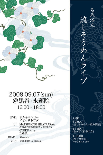 告知失礼致します。 MATSUMOTO HISATAAKAA氏 お寺でプレイ! 風情あるお寺のお庭にてゆるりしませんか? 浴衣着納めつつ、そうめん流しつつ、音に身を委ねつつ、去り行く夏を送る会。 民族楽器+デジタル+α…といった感じのライブ、good vibesなDJs。 老若男女問わず楽します。 昼寝もできます。 本気流しそうめんつき、フリードリンクです。 PARTY ! 9/7(日) 黒谷 永運院@京都 「名残浴衣&流しそうめんライブパーティー」 12:00-18:00 2000円飲み放題+流しそうめん 中高生1000円。子供は無料。 ※お