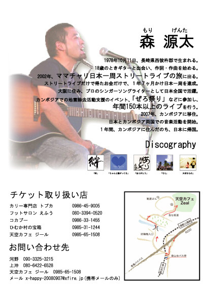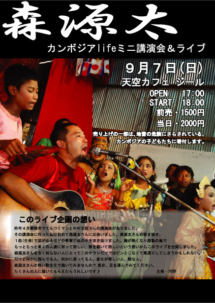 森源太カンボジアLIFEミニ講演会&ライブ2008年9月7日(日)天空カフェジール(宮崎市加江田)オープン17時/スタート18時前売り 1500円 当日 2000円 イベントなんかしたこともないく何も分からないままライブ企画しましたなぜかと言うと→想い・・・去年4月都城市でてんつくまんと中村文昭さんの講演会がありました。その講演会に行った私は初めて森源太さんに出会いました。森源太さんの歌を聞き、1曲(生命)で涙が出るほどの衝撃が私の中を突き抜けました胸が熱くなり感動の嵐でもっともっと多くの人達