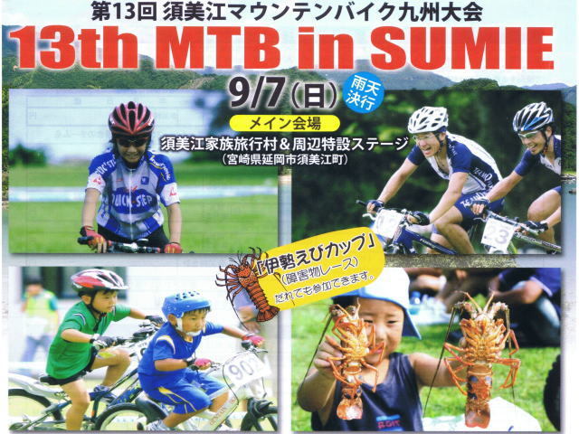 今年も9月6日と7日に須美江家族旅行村&周辺特設ステージにて第13回MTB in 須美江が開催されます。絶景のオーシャンビューコースを個人でチームで駆けぬけてみませんか? 応援も大歓迎! 参加をお待ちしています。 詳しいイベント情報はホームページをご覧ください。 パソコン用ホームページからは参加申込書もダウンロードできます。 【PC用】http://www5.ocn.ne.jp/~jump/ 【携帯用】http://www5.ocn.ne.jp/~jump/m/ ◇大会のココがポイント! ?自転車教室は大人もOK! 親子でうまくなろう。(先着20名限定) ?「チャレンジ」クラスを新