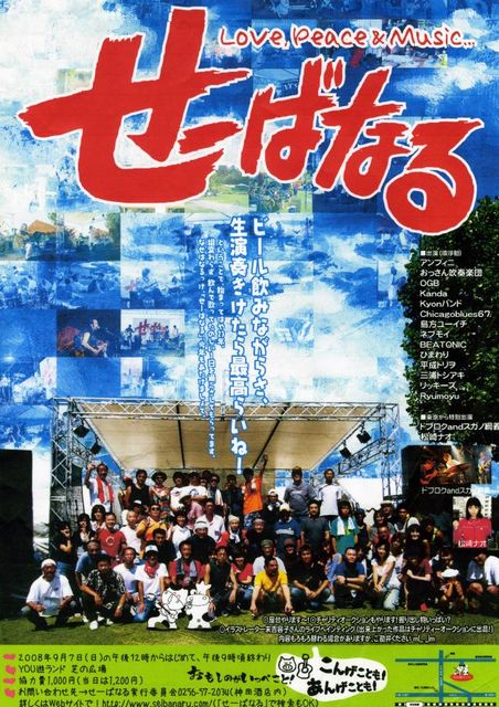 告知させていただきます。 七日(日)に南蒲・田上町にあります総合公園YOU遊ランド内・芝の広場特設ステージにて 「せ〜ばなる2008」を開催いたします。 公式HPはこちら→http://www.seibanaru.com/ ♪内容 県内外アマチュアバンド14組による演奏 チャリティーオークション 屋台(生ビール・焼鳥・うどん・そば・蒸し物、計8〜10ブース) ♪東京から特別出演 ドブロクandスガノ綱義・・・http://www1.plala.or.jp/dobu/pc/ 松崎ナオ ・・・・・・・・・http://www.matsuzakinao.com/ 開場・・・・・・・・11:00