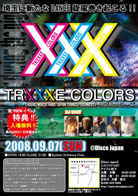初めまして 9月から新しいイベントをします その告知です お暇があればいらしてください ジャンルはALL TRANCEになります☆ [ EVENT INFORM ] 【 TRXXXE COLORS 】 [Date] 2008.09.07 (SUN) [Time] 14:00 〜 21:00 [Place] @ DISCO JAPAN [Rate] 無料 [Sound] Cyber / Hard / Epic etc... [Organizer] Tamaki [Resident DJ] Table-X [DJ's] ANDo-☆ 流雅 Tamaki Table-X [Time Table] 14:00〜15:00 DJ ANDo-☆ 15:00〜15:40 DJ Table-X 15:40〜16:20 DJ Nargo 16