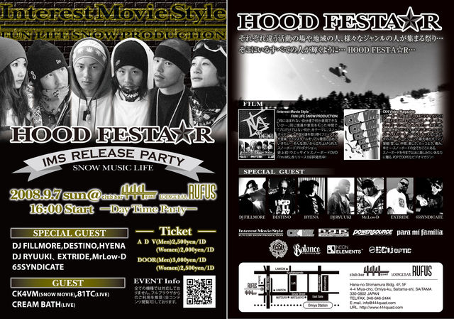 9月7日に試写会を大宮で開催決定!!!!!! 今年からドロップのドメスティックムービー「IMS FILM」と 「CK4VM」がコラボします。 当日は試写の他にもアーティストのライブなどもあってこちらも盛りだくさんなイベントです。 CK4からも多数プロライダーが当日イベントに参加します。 8月23日に行けない方は9月7日に大宮に集合です。 9月7日16:00START PLEACE:CLUB444QUAD ACCESS さいたま市大宮区宮町4-4 花のシマムラビル 4F TEL: 048-646-2444(18:00〜) Mail: info@444quad.com