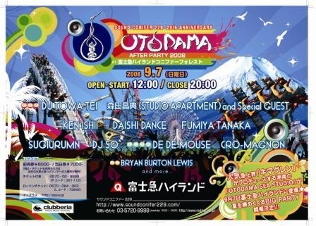 http://mixi.jp/view_community.pl?id=3592077 2008.9.07 (Sun) OPEN/START:12:00〜20:00 at 富士急ハイランド コニファーフォレスト SOUNDCONIFER 20th ANNIVERSARY 音霊 −OTODAMA AFTER PARTY 2008− ENTRANCE FEE: ..6000yen(Advance) ..7000yen(On The Day) ※チケットをお持ちの方は当日のみ富士急ハイランド入園料が無料 出演者(スペシャルゲスト)発表! 追加出演者として「キマグレン」が決定。 「森田昌典(STUDIO APARTMENT) × キマグレン」としてして出演します。 DJ TOWA TEI 森田昌典(STUDIO APA