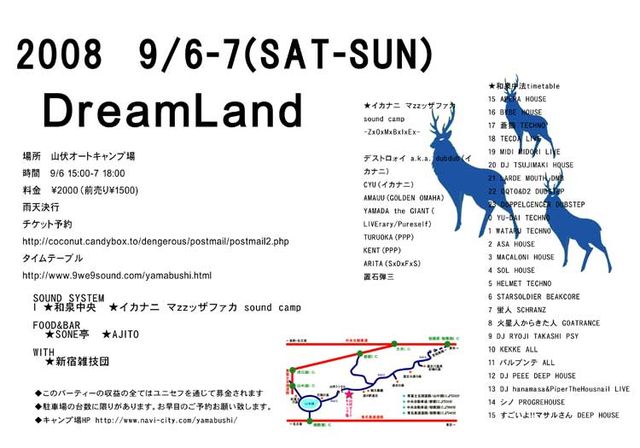 2 sound system open air charity rave party ★DreamLand★ http://www.9we9sound.com/yamabushi.html 2008年9月6日(土)〜7日(日) 6日15:00-7日18:00 @道志村 山伏キャンプ場 http://www.navi-city.com/yamabushi/info.html entarance 2000yen (前売り 1500yen) parking ticket 車1台 500 チケット予約http://coconut.candybox.to/dengerous/postmail/postmail2.php チャリティー野外レイヴドリームランドの収益の全ては (財)日本ユニセフ協会を通じ世界の子供達の為に利用されます。 駐車場の台数に限りがありま