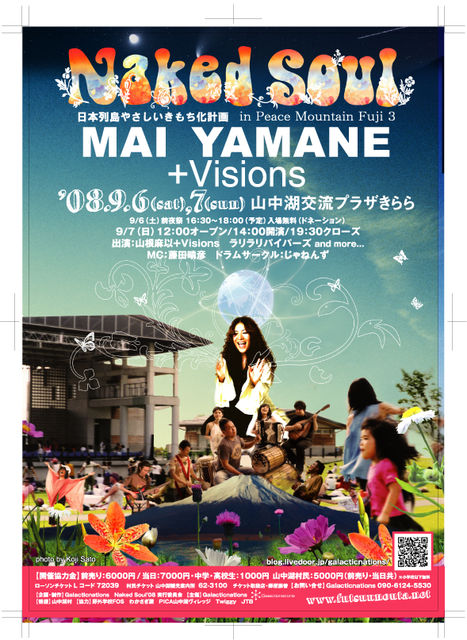 日本列島やさしいきもち化計画 in Peace Mountain Fuji 3 おといろ おとなみ ひとはあい (公式ブログはこちらから) http://blog.livedoor.jp/galacticnations/ 今年のNaked Soulは、山根麻以+VIsionsのコンサートをたっぷりと楽しんでいただきます。 ゲストに「ふつうの唄」から山根麻以のレコーディングに欠かさず参加している佐野聡のホーンセクションの参加が決定! 3時間半の大スペクタクル。 これはぜったいみのがせない!!! 出展・出店の募集もはじまります! すでにたくさんお問い合わせいただいております