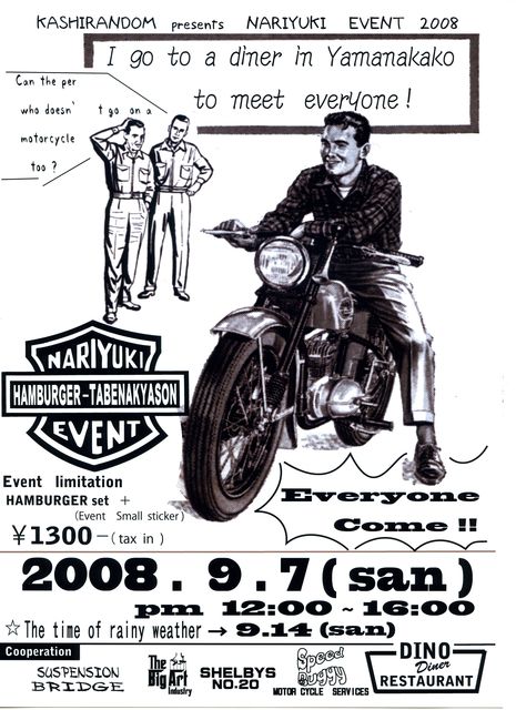 えー、Cherryさん、参加の皆様、いつも大変おせわになっております。 先日発表いたしました、山中湖のDinoDINERでのイベントの詳細が決まりました。 日程は、9月7日日曜日。(雨天順延)現地にお昼前後集合で、まあ夕方まで適当に。 それと、当日、横浜ムーンアイズ、エリア1にて朝8時からモパーメインのモーニングクルーズも開催されるそうなので、朝横浜に顔出してからのんびり山中湖、なんてプランもいかがでしょうか。 あと、会場はDinoDINERで地図はここ。DinoDINERのコミュ http://mixi.jp/view_community.pl?id=3627337