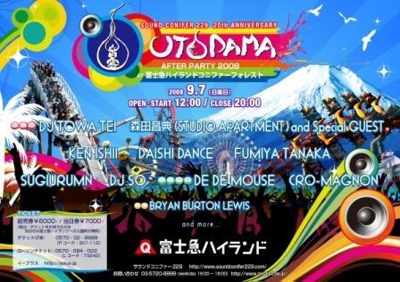 http://mixi.jp/view_community.pl?id=3592077 2008.9.07 (Sun) OPEN/START:12:00〜20:00 at 富士急ハイランド コニファーフォレスト SOUNDCONIFER 20th ANNIVERSARY 音霊 −OTODAMA AFTER PARTY 2008− ENTRANCE FEE: ..6000yen(Advance) ..7000yen(On The Day) ※チケットをお持ちの方は当日のみ富士急ハイランド入園料が無料 出演者(スペシャルゲスト)発表! 追加出演者として「キマグレン」が決定。 「森田昌典(STUDIO APARTMENT) × キマグレン」としてして出演します。 DJ TOWA TEI 森田昌典(S
