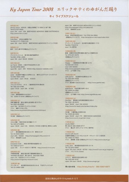 2008年9月8(月) 横浜 club Lizard http://www.fad-music.com/club_lizard/welcome.html OPEN 18:30 / START 19:00 ADV\1500yen / DOOR \2000yen 交通 ●みなとみらい線 元町中華街駅より徒歩2分 みなとみらい線元町中華街駅の1番出口から徒歩2分 ●山下公園より徒歩2分 山下公園中央口の信号を入り、交差点を2つ通過。中華街東門の信号を左折。1つ目の信号横浜天主堂跡の信号を左折。次の交差点1つ目の角B1F ●JR石川町駅より徒歩15分 JR石川町駅南口改札を出て右へ、タワーレコードの交差点を直進。元町商店街出口の交番を左