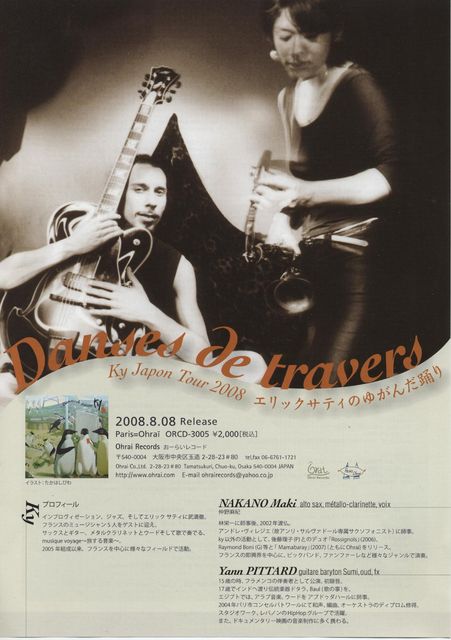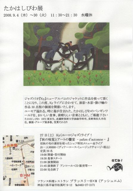 既に始まってしまってますが、、、 よろしければ、見てやってください〜 たかはしびわ展 チラシhttp://www.geocities.jp/takahashibiwa/DMHM2008-09-04.html Kyニューアルバム『Danses de travers』エリック・サティのゆがんだ踊りhttp://www.geocities.jp/takahashibiwa/ky2008-08.html 2008年9月4日(木)〜30日(火) ニューアルバムに作品を使ってもらう縁で、ライブ会場の一つで個展を開催することとなりました。 ジャズユニットKyライブ 27日(土)19:00〜 『秋の味覚とアートの饗宴 - pafum d'automne -