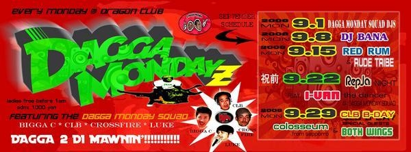 ●9/8 DJ BANA & DAGGA MONDAY SQUAD (*BIGGA C*CLB*CROSSFIRE*LUKE*) ADM:¥1,000 /※ Ladies free before 1 am STARTS:23:00〜 *DRAGON CLUB* * 横浜市中区曙町1-2ドラゴンビル 045-262-2601 http://www.dragon-club.asia/ * * * * *