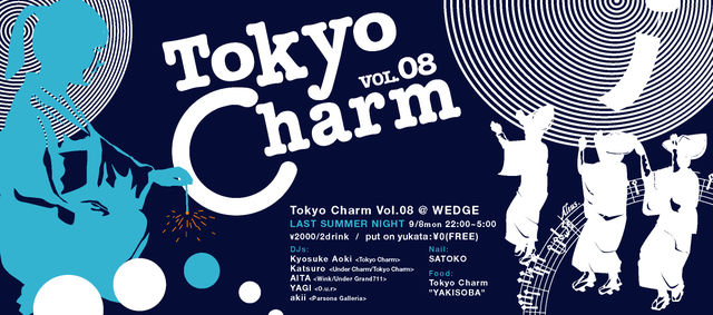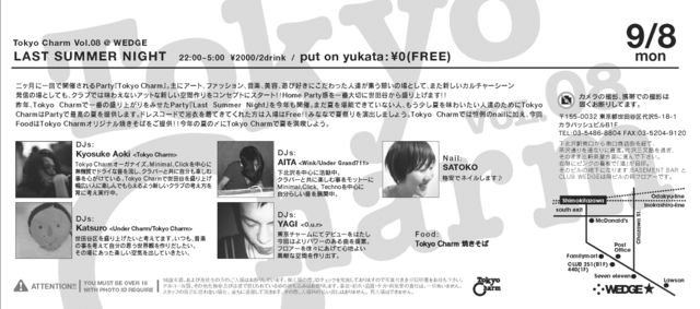 二ヶ月に一回で開催されるParty『Tokyo Charm』 主にMUSIC×ART×FATION 遊び好きにこだわ った 人達が集う憩いの場。 また新しいカルチャーシーンの 発信の場としてクラブでは味わえないアットな空間作りと Home party感 を一番大切にし、世田谷から盛り上げます!! 遊び好き集まれ! 昨年もこのテーマで開催し、Tokyo Charmで 一番の盛り上がりをみせたParty 『Last Summer Night』 今年も『Last Summer Night 』にし まだ夏を堪能できなかった人、 もう少し夏を味わいたい人達のために
