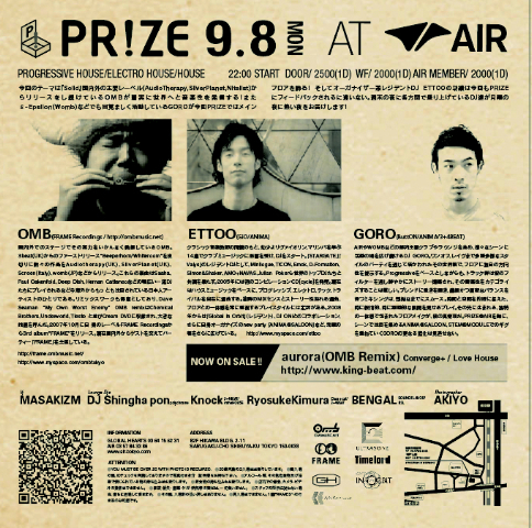 管理人様、告知失礼致します。 平日のオーディエンスのための贈り物“PRIZE”。 レジデントに海外のレーベルから多数のヒット作品をリリースするプログレッシブハウスシーンのアーティスト、OMBを迎え、月曜日では異例の豪華ARTIST&DJ陣で 毎奇数月第2月曜日代官山AIRで開催中 !! ...Next... PRIZE Vol.11 @ AIR (http://www.air-tokyo.com/) 9,8 MONDAY AT AIR 22:00 START DOOR / 2500 (1D) WF / WF 2000 (1D) AIR MEMBER 2000 (1D) "Next Concept" 今回のテーマは『Solid』国内外の主要レーベル(A