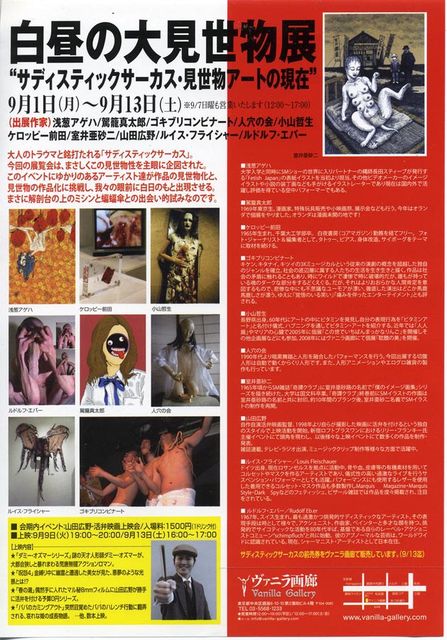 ”見世物アートの現在展” 9月1日〜9月13日(9/7日曜日も営業します) 出展作家:浅葱アゲハ。駕籠真太郎。ゴキブリコンビナート。人穴の会。小山哲生。ケロッピー前田。室井亜砂二。山田広野。ルイス・フライシャー。ルドルフ・エバー。 於:ヴァニラ画廊(東京都中央区銀座6−10−10 第2蒲田ビル 4F) でんわ:03-5568-1233 http://www.vanilla-gallery.com/gallery/sc/sc.html