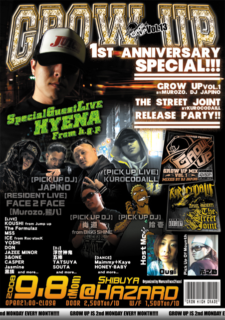 9月8日(MON) 渋谷HAZARD(旧es)にて【GROW UP】というイベントがあります 今回で1周年 GUEST LIVEには… 横浜h.g.pからHYENAが参戦 そしてRELEASE LIVEとして… 池袋から8/27に【THE STREET JOINT】をリリースしたKUROCODAiLLも参戦 その他、主催者のMUROZO率いるFACE2FACEのライブ、FACE2FACEからDJ JAPiNOやBIGG SHINEのDJ 尚道 渋谷のバイブス全開な若手達で開催します ゲストも取りますし、場所の説明も致しますのでメッセかコメント下さい MUROZO PRESENTS!!!! 【