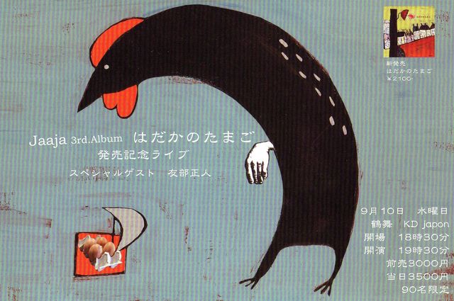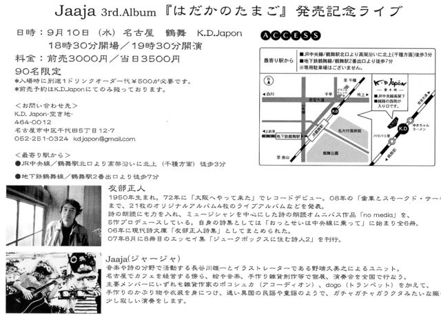 Jaajaレコ発ライブ!!Special Guest:友部正人告知させてください。 Jaajaが8月10日頃に3作目になるアルバム「はだかのたまご」を発売します。 で9月10日にアルバム発売記念ライブを鶴舞K.D. Japonにて行います。今回はSpecial Guestとして、なんと友部正人さんが出演してくれる事になりました。 K.D. Japonで友部さんがライブをやるのはこれが初めてです。お店の雰囲気と友部さんの歌や声や存在がとても良い組み合わせになると思うのでとても楽しみです。 混雑が予想されるので、限定90名のライブです。Jaajaや友部正人さんに興味