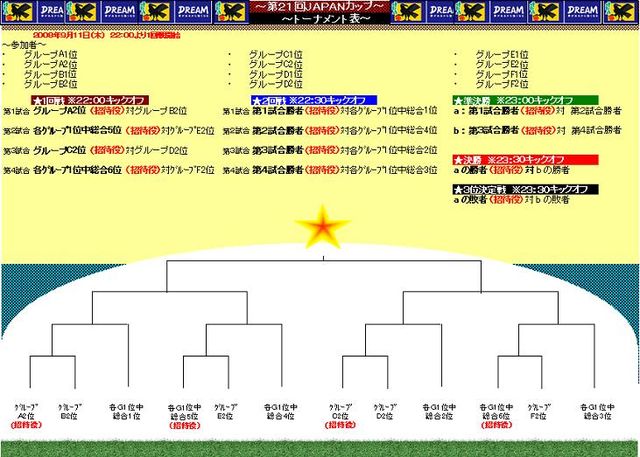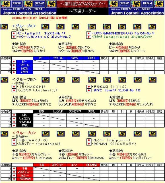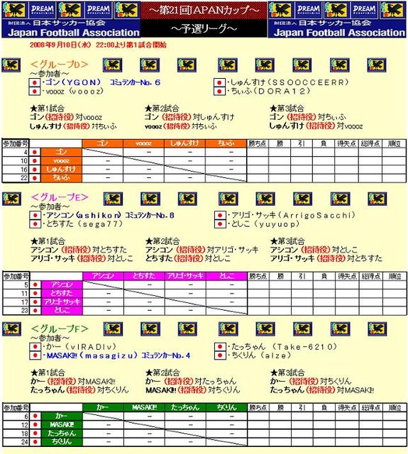 最初に!参加の際、IDの記載がない場合、参加と見なしません。 第21回JAPANカップ[PS3版]を開催致します 予選リーグ(4人×6グループ)、及び決勝トーナメントを下記日程にて 行なっていきます。 ※予選については、参加人数により若干変更となる可能性があります。 募集人数 24人 日程 9月10日(水)22:00よりグループ毎にて予選リーグ(1人計3試合消化) 勝ち点→得失点→総得点→当該対戦成績→参加応募先着順…にて順位を決めます。上位2位の方のみ11日のトーナメントに進みます。 9月11日(木)22: