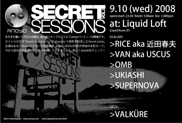 平日の夜にこっそり開催します(笑)お時間がある方は是非!!!!! SECRET SESSIONS VOL.1 9.10(WED) 2008 open/start 24:00 finish 5:00 am fee : \1,500 venue : Liquid Loft (Liquid Room 2F) DJ and LIVE OMB (FRAME/OMBMUSIC.NET/anoyo) VAN aka USCUS (RASPUTIN REC./anoyo) RICE aka 近田春夫 (anoyo) UKIASHI (anoyo) SUPERNOVA (anoyo/PANGEA/FRESH!!) DECO : VALKURE まだまだ暑いド平日の水曜日、恵比寿リキッドロフトにてanoyoパーティーの開催です。 タイトルの示す”Secret Sessions Vol.1” はanoyo 十周年を記