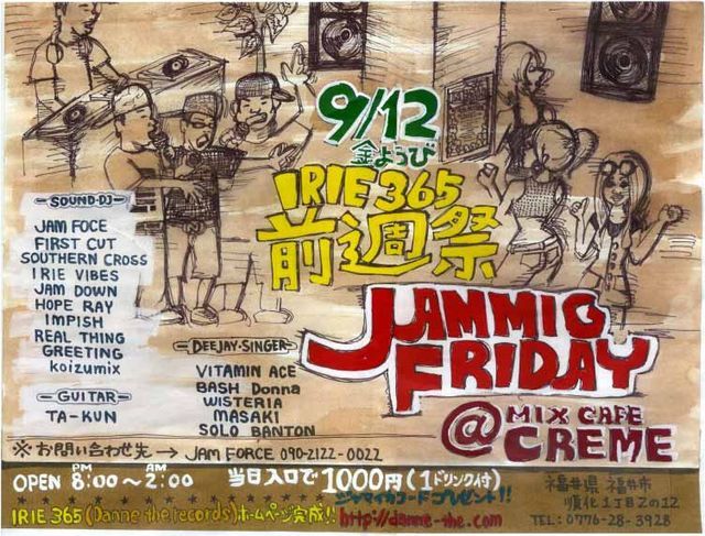 今回のJAMMING FRIDAYはIRIE365前週祭ということで、 地元福井ALL STARってかんじでやります。 前週祭ってことで翌週にむけてバイブスあげていきましょう。 ちなみにTA-KUNがGUITARひきます。 珍しい人も登場します。ってことで金曜ヒマな人はCREAM集合! IRIE365のHPできました! http://danne-the.com JAMMING FRIDAY 〜IRIE365 前週祭〜 9/12@CREAM http://www.creme.jp/ OPEN 20:00〜2:00 入場料¥1000/1D&JAMICA FOOD! 〜SOUND・DJ〜 JAM FORCE FIRST CUT GREETING SOUTHERN CROSS IRIE VIBES JAM DOWN IMPISH