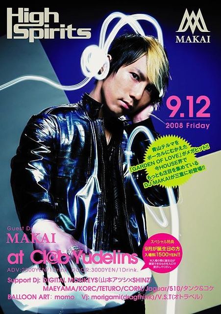 毎回豪華ゲストを呼んで行われるハウス、テクノ、エレクトロ中心のBIGイベント !!!High Spirits !!! 今回のゲストは何と!!!! 青山テルマをボーカルに向かえた 「GARDEN OF LOVE」メガヒット!! 今HOUSE界でもっとも人気注目を集める あのDJMAKAIが三重初登場!!!! 暑い夜がさらに熱くなることまちがいなしです!! MAKAIプロフィール 90年代後半に出身地福岡でDJ活動開始。活動拠点を東京へ移し、2005年に1stアルバム『Frontier』をリリース。先行でカットした12インチ・アナログ「Frontier EP」が