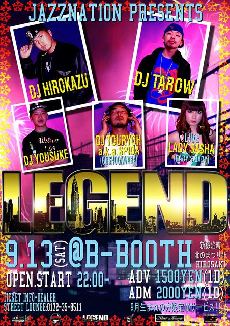 *LEGEND* JAZZNATIONホムペ↓ http://sky.ap.teacup.com/jazznation/ mixi Community http://mixi.jp/view_community.pl?id=3216616 9/13(SAT) @B−BOOTH HIROSAKI 鍛治町北のまつり4F OPEN/START10:00〜 ADV¥1500(1Dr) ADM¥2000(1Dr) *今回限定企画* 9月生まれの方限定、1Drサービス!! 入場の際、生年月日を確認出来るものを提示いたしますと、 1Drチケがもらえちゃう! *DJ* HIROKAZU TAROW