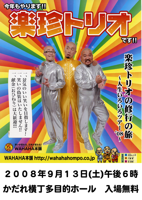 WAHAHA本舗 楽珍トリオの修行の旅〜人生いろいろツアー08〜 入場料は無料!! 1.景気のいい笑いを目指します! 1.笑いの偽装はいたしません!! 1.献金(おひねり)は大歓迎!!! http://wahahahompo.co.jp/