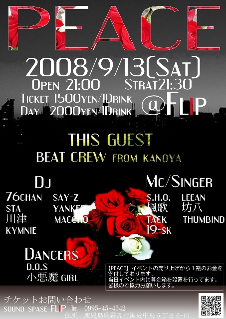 今夜のFLIPのイベントは今回で4回目になるPEACE Crewによるイベント【PEACE】♪前回のイベントでは¥2万3330集まりました!ありがとうございます!! 今年の夏にはオレンジ学園で行われた夏祭りにPEACE Crewとして参加できて本当に良い活動ができました。色んな事を学んだりとても良い出会いができました☆ 今回イベントのPEACEでは、毎回の事のようにイベント中に募金豚(募金箱)を用意してるんで、イベントで思いっきり暴れた際に募金してください(笑)。きっと、どこかで誰かの助けになります♪ 皆が音楽やダンス好きな事が出来てましてや、
