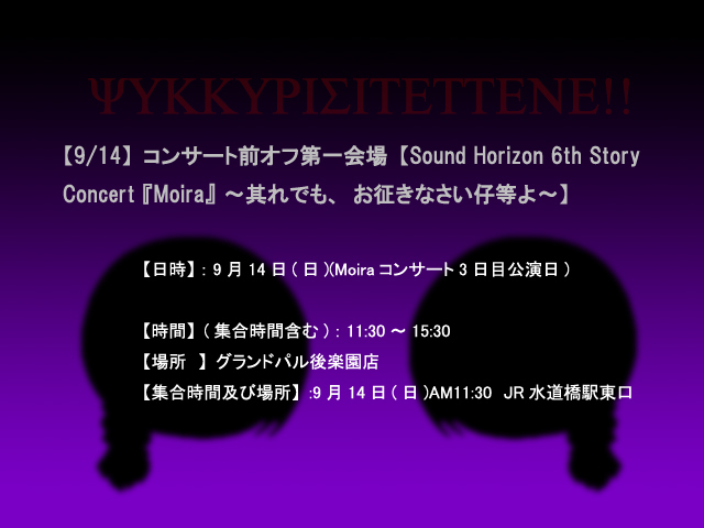 初見の方始めましてどっかのオフで会った人ボンソワール ちゃるむです、久しぶりに休みとれそうですので14日の 公演に合わせてカラオケオフでもしようと思います。 (突発でなかなか調整し辛いかと思いますがよろしければ…) 【日時】:9月14日(日)(Moiraコンサート3日目公演日) 【時間】(集合時間含む):11:30〜15:30 場所 グランドパル後楽園店 東京都文京区本郷1-14-3 東野ビル3F〜4F 03-5802-0678 (詳細URL: http://www.ppal.co.jp/frame0/kourakuen.htm ) (地図: http://www.ppal.co