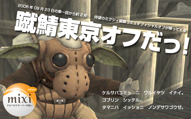 前回の東京蹴鯖オフから2年。 すでに同名トピにてご案内させていただきましたが、ついに3回目を行うことにしました!(わー、パチパチ) オフではお酒を戴きつつ、皆さんでチョコボレースを今後どうしていくか検討していただくもヨシ、同じ時間帯にインできる人を探して、一緒にミッションでも進める話もよし、ミスラの服はどれが一番好きかとか猫好きのあなたも参加できます! 当日はダチョボナンザ(別にダチョボナンザでもいいけどw)改め、ケルボナンザとして何かしらイベントを考えてますし、チョットだけウレシイ、顔と名前と