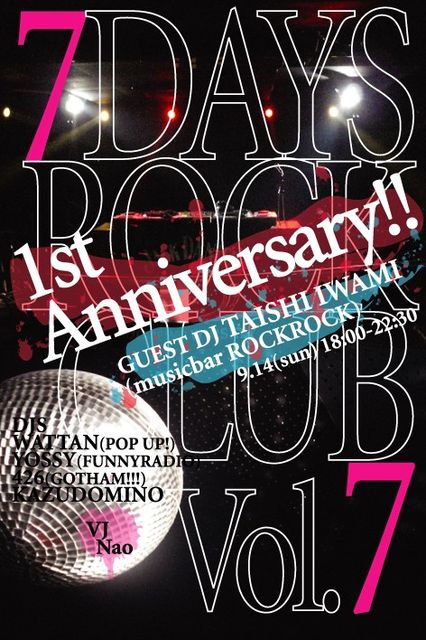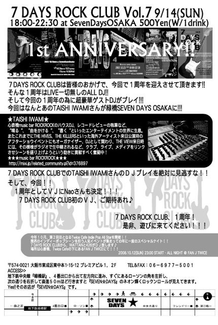 あの・・・・実は、この度、ワタクシが大阪の緑橋で主催させて頂いている7 DAYS ROCK CLUBというイベントが1周年を迎えます。ハイ。
