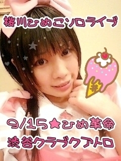 ついに発表されました! 桜川ひめこの最重要イベント ソロライブ「ひめ革命」の日付と場所が決定です! (以下、現時点で判明していることです) 9/15(祝)桜川ひめこソロライブ「ひめ革命〜めろめろ Only now!〜」 時間:19:00開場 19:30開演 場所:渋谷CLUB QUATTRO 東京都渋谷区宇田川町32-13 4・5F 03-3477-8750 http://www.club-quattro.com/access_shib.html 料金:予約・当日3500円(ドリンク代込み) 出演:桜川ひめこ ☆整理番号順の入場になります (FC→マーベルエール予約&手売りチケット→ぴあ&ローソンチケット)