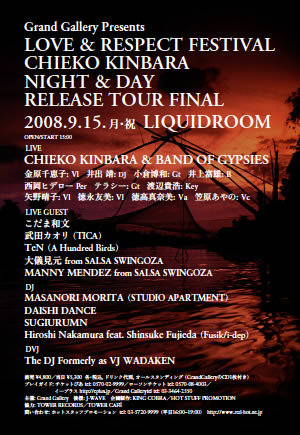 管理人様 告知失礼致します。 現在THE RISING SUNリリースツアー真っ最中のMASANORI MORITAが9月15日(月・祝)LIQUID ROOMに登場!! Grand Gallery Presents Love&Respect Festival Chieko Kinbara Night&Day release tour finalと題され、CHIEKO KINBARA &BAND OF GYPSIESが登場!! そのほかにもMASANORI MORITA、DAISHI DANCE、そしてVJ WADAKENをはじめ、そうそうたるメンバーが大集結!! LIVEあり、DJあり・・・ハウスシーンの重要人物達が一堂に会すイベントをお見逃しなく!! -------------------------------------------------