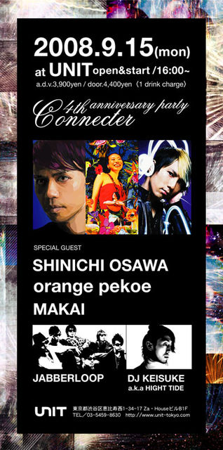 9月15日祝日 3連休最後の日の午後に大沢伸一で踊りませんか? 大沢さんは好きなんだけどクラブ行ったことないし‥ 最近はクラブに行く元気がないよ〜オールはつらい。 なんて方にオススメのイベントです! しかも共演も超豪華! 休日の午後からクラブの雰囲気を体感でき明日の仕事にも差し支えない! 限定450名のスペシャルなイベントです! 9、15の休日は一緒に楽しみましょう! 詳細 相模大野にある隠れ家的存在のconnecter4周年を祝うアーティストが 9.15祝日に代官山UNITに集結! このプレミアムイベントに 来