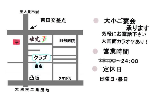 久々で大泉で飲み会ですねー 入社したころは、大泉でハシゴしたほどでしたが・・・ 大泉町吉田スナック「クラブ」です。地図を添付しておきますね! 9月19日 18:30〜 出席最終確認は、今月いっぱいです。景品や賞金を用意する為、 携帯メールでも配信しますが・・・