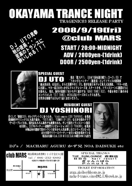 『OKAYAMA TRANCE NIGHT』 〜TRAGENIC#3 PARTY〜 2008/9/19(金) @club MARS(岡山市表町) TEL/0862331160 OPEN/20:00〜MIDNIGHT 前売\2000-(1drink) 当日\2500-(1drink) ■special guest □DJ UTO ■resident guest □DJ YOSHINORI ■DJ's □AGURU MACHARU かず兄 KING NOA パーティー連動型MIX CD『TRAGENIC#3』の発売を記念してのリリースツアーを岡山で開催 スペシャルゲストにはなんと、歌スタ(日本TV系)などでもお馴染み、世界に名を馳せる日本TRANCE界の重鎮、QUAKE RECORDS主宰DJ