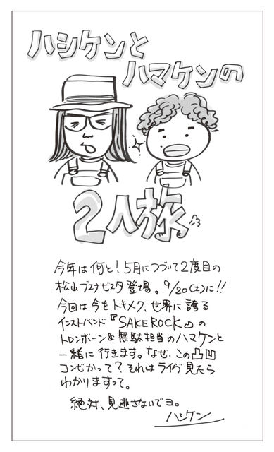 ハシケン&浜野謙太(SAKEROCK)の2人旅 in 松山 日時:9月20日(土) 時間:開場19:00 開演20:00 料金:前売¥2500− 当日¥3000− 場所:ブエナビスタ 松山市梅津寺町1329 089−953−4886 チケット好評発売中。 電話、Mixiメッセージ等でも、ご予約を受け付けております。 お気軽に、お問い合わせ下さい。 ・・・・・・・・・・・・・・・・・・・・・・・・・・・・・・・・・・・ 今年、2度目となる、「ハシケン」。 5月の「Saigenji」とのライブの興奮が冷めやらぬう