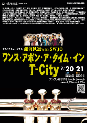 はじめまして! 香川県で活動していますアマチュア劇団、『☆銀河鉄道』と申します! 来たる2008年9月にアルファあなぶき小ホールで、公演をやります! 今回は、海外でも活躍中のJAZZオーケストラ、『SWJO(スウィンギン・ワンダーランド・ジャズ・オーケストラ)』とのコラボです 演奏はすべてSWJOさんによる生演奏 すべてオリジナルの曲になっており、 このミュージカルで使われたいくつかの曲は後日『まちうた第三弾』として、 CD化される予定です。 公演名