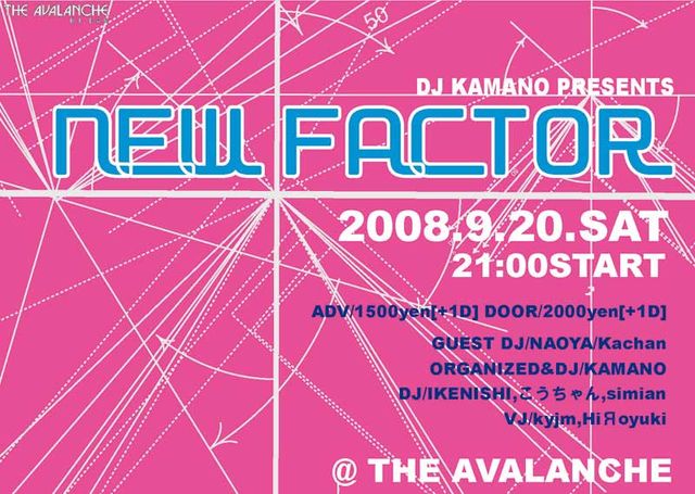 高松テクノ・ハウス界の重人 DJKAMANOが仕掛ける これから育っていくであろう 若手DJ、VJをピックアップした クラブイベント「new factor」 GUESTDJにNAOYA,Kachanを迎え 懲りずに5回目もやっちゃいます。 DJ KAMANO PRESENTS NEW FACTOR5 2008.9.20.SAT 21:00START DV/1500yen[+1D] DOOR/2000yen[+1D] ORGANIZED&DJ/KAMANO GUEST DJ/NAOYA/Kachan A DJ/IKENISHI,こうちゃん,simian VJ/kyjm,HiЯoyuki The AVALANCHE 高松市瓦町1-9-9瓦町ビル4F:087-862-1655