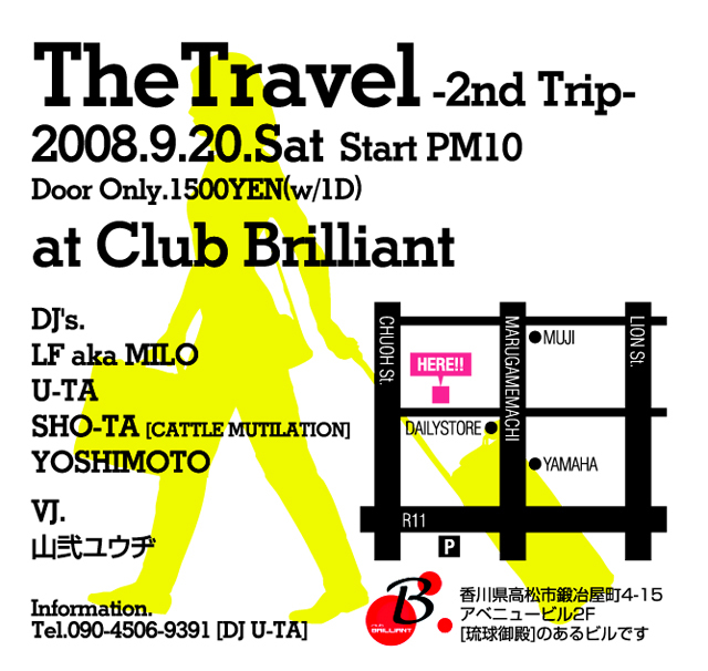 6月に行われた初回がかなり好評だった[ The Travel ]。 コマーシャルな音だけでなく【DEEP HOUSE】でピークタイムを迎える、 いわばHOUSEの本質、CLUBの本質に触れることのできるパーティです。 ダンサーやコアなリスナーにも支持された、 懐の深い選曲の4DJに加え、VJに山弐ユウヂが参加。 さらにHOUSEMUSICにハマれる空間に。 ■The Travel -2nd Trip- 9/20(土) 22:00 START at Club Brilliant 高松市鍛冶屋町4-15アベニュービル2F 当日1500円(1ドリンク付) DJ >>> LF aka MILO/U-TA/SHO-TA/YOSHIMOTO VJ >