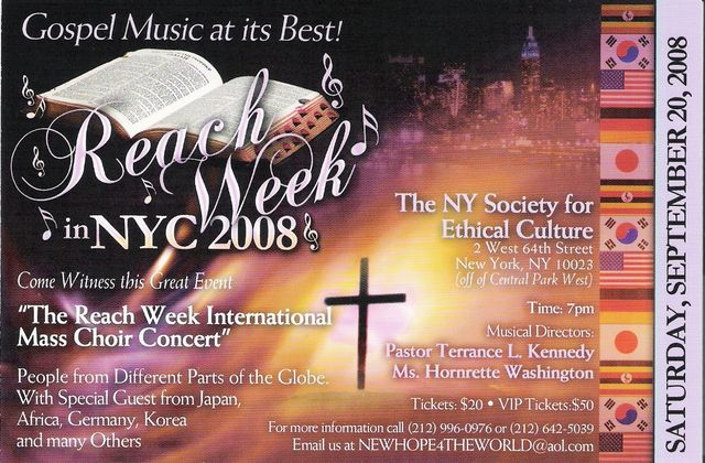 9月20日(土)NY Society for Ethcal Culture Hallにて、REACH WEEK INTERNATIONAL MASS CHOIR のコンサートを行います。