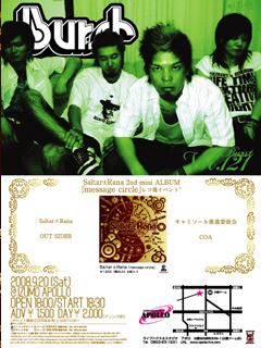 Saltar±Rana ”2nd mini ALBUM 「message circle」先行発売イベント” OPEN 18:00 / START 18:30 ADV ¥1,500/ DAY ¥2,000 (税込/ドリンク別) 【出演】 Saltar±Rana OUT SIDER キャミソール推進委員会 COA 【チケット発売日】2008年8月9日(土曜) 【プレイガイド】 ローソンチケット/Lコード:69883 チケットぴあ/Pコード:300-339 出雲 APOLLO (店頭・電話・メール予約) BURST (イベント会場販売・メール予約) 各出演者ホームページ予約 等 【BURST HP】 http://ip.tosp.co.jp/i.asp?i=bu