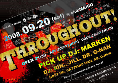■9/20(SAT) @CLUB MAIRO 【THROUGH OUT!】 OPEN/21:30 ADV/2000YEN(1D) DOOR/2500YEN(1D) 22:30まで来場の方プラス1DRINKプレゼント!! PICK UP DJ:MARKEN DJ:RIN / JILL / DR / G-NAN HOST MC:GATTSUKI MAN / SG / 029 富山では数少ないDJのみのHIP HOPイベント[THROUGH OUT!]です! 今回はPICK UP DJとして最近」MIX CDを発売したばかりの DJ MARKENを迎えています!! DJ ONLYのイベントなので気軽に遊びに来て下さい!!