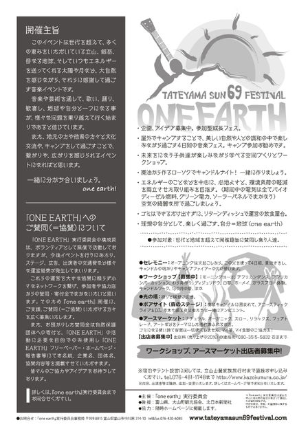 管理人様〜告知させてくだされ〜〜 いよいよ明日から富山の霊山、立山で素敵なお祭りが開催されます。 よかったら遊びにきてください^^ )) 大地に生きる人々は古来より 『水は大地と人をつなぐ血液』 『火にはスピリット魂が宿る』と 考えてきました。 ONE EARTH では、 現代の都市生活で おろそかにしてしまった火と水に対して 最大限リスペクトし 資源を大切にし、循環させるとともに エネルギーの自立を目指しています。 【TATEYAMA SUN 69 FESTIVAL】 『one earth』