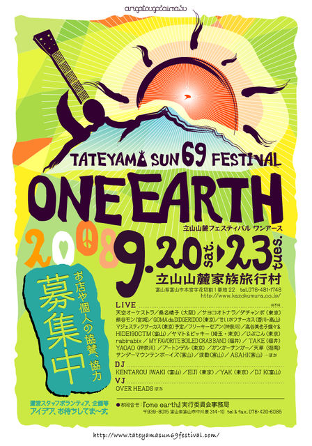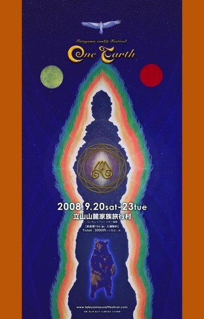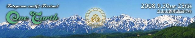 いよいよ明日から富山の霊山、立山で素敵なお祭りが開催されます。 よかったら遊びにきてください^^ 大地に生きる人々は古来より 『水は大地と人をつなぐ血液』 『火にはスピリット魂が宿る』と 考えてきました。 ONE EARTH では、 現代の都市生活で おろそかにしてしまった火と水に対して 最大限リスペクトし 資源を大切にし、循環させるとともに エネルギーの自立を目指しています。 TATEYAMA SUN 69 FESTIVAL 『one earth』 2008年9月20日(土)〜23日(火) 前夜祭19日