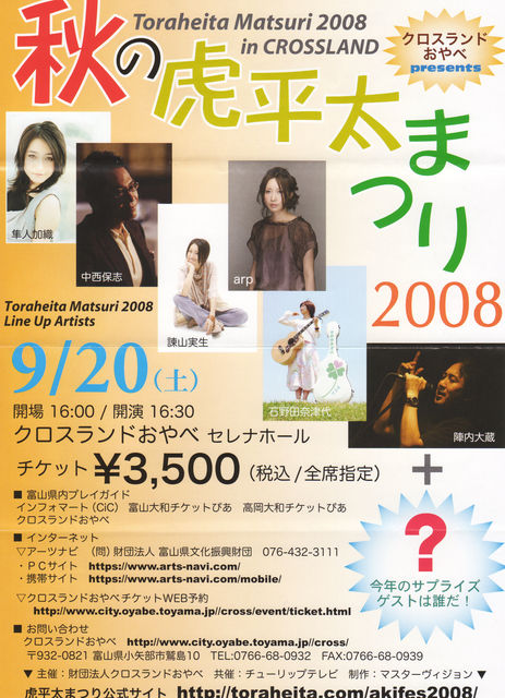 【クロスランドおやべpresents 秋の虎平太まつり2008】 日時:2008年9月20日(土)Open 16:00 / Start 16:30 会場:クロスランドおやべ セレナホール 出演:中西保志 / 陣内大蔵 / arp / 石野田奈津代 / 諌山実生 / 隼人加織 他 チケット:前売・当日とも¥3,500(税込/全席指定) 7月6日(日)チケット発売開始 お問い合わせ:クロスランドおやべ 0766-68-0932 http://www.city.oyabe.toyama.jp/~cross/top.html プレイガイド:クロスランドおやべ、インフォマート(CiC)、 アーツナビ http://www.arts-navi.c